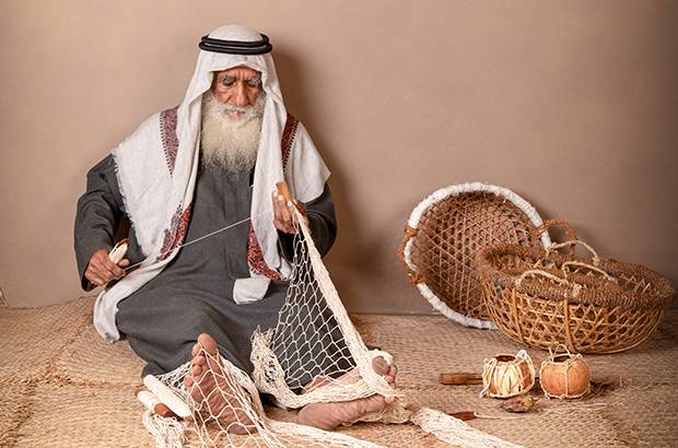 The crafts represented in House of Artisans celebrate the creative and artistic relationship between the people of the United Arab Emirates and the locally available natural resources. Within the diverse landscapes of the UAE- from the desert, to the oases, to the coast and sea- artisans have developed skills to meet functional and economic needs. The crafts made through these skills show a creative artistic expressions and aesthetics. Shared from generation to generation, they preserve not only the practical skills but also the shared social values associated with Emirati identity.